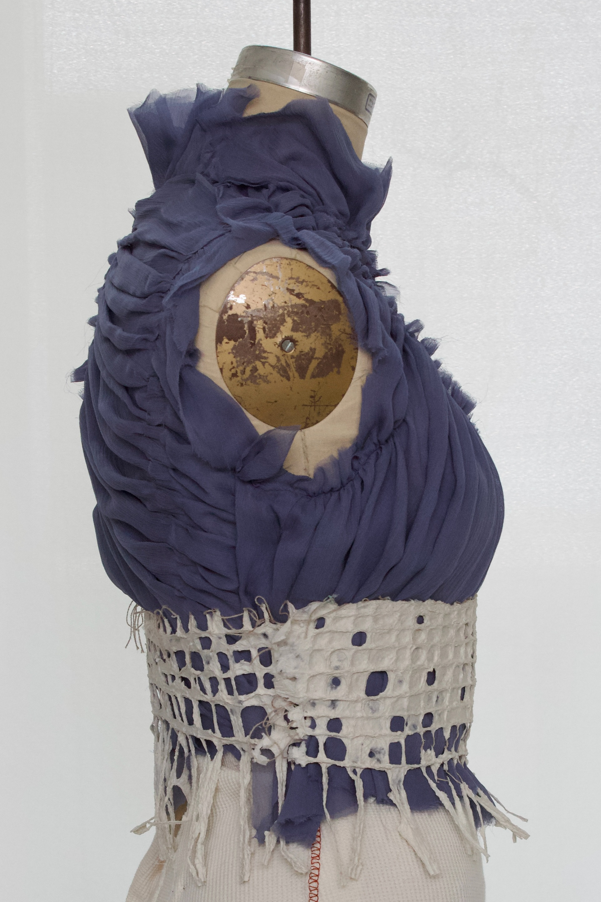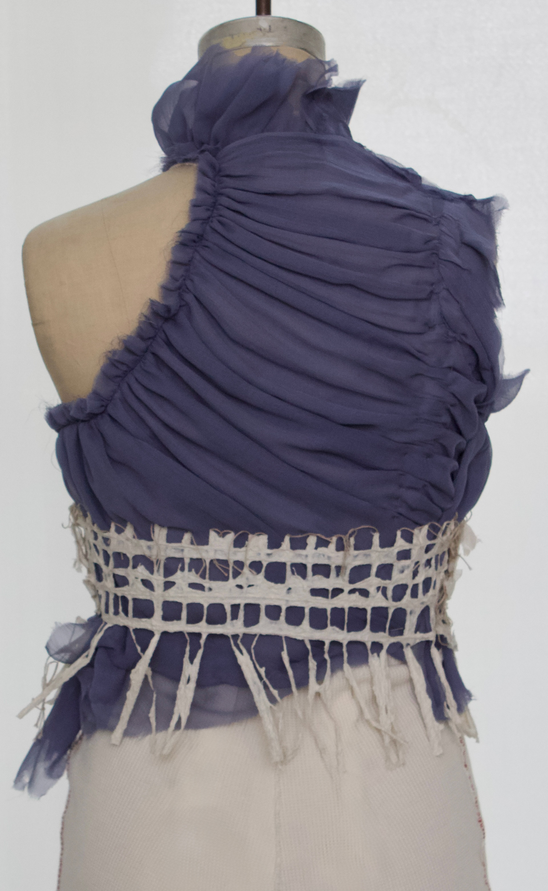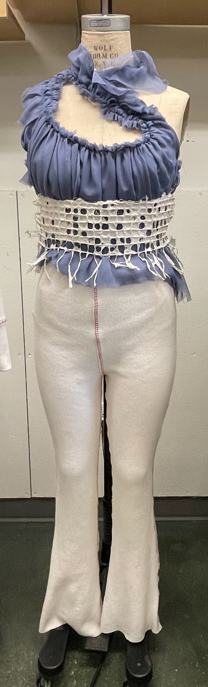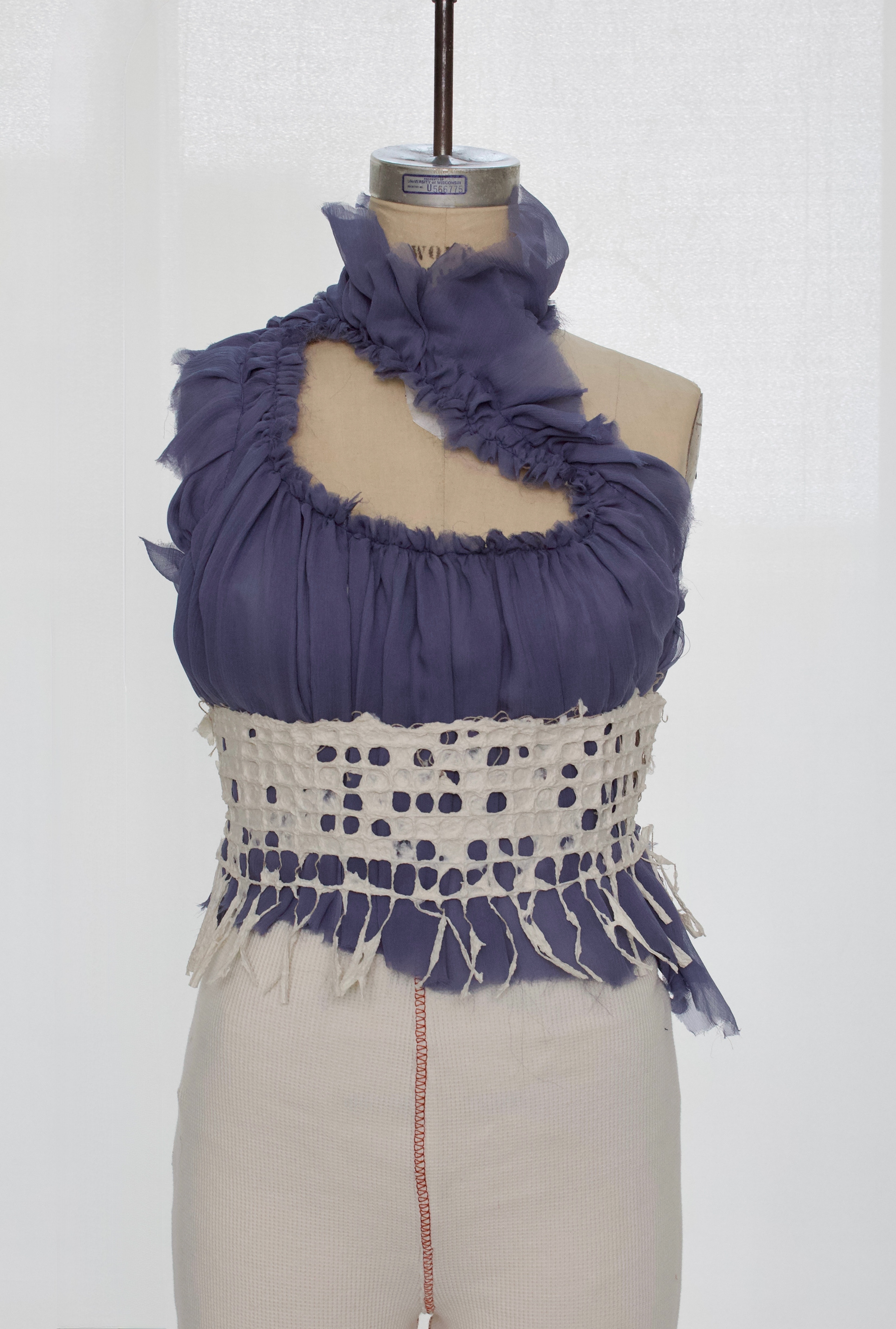 Silk chiffon top, with hand-made hemp paper corset; waffle-knit flare pant.