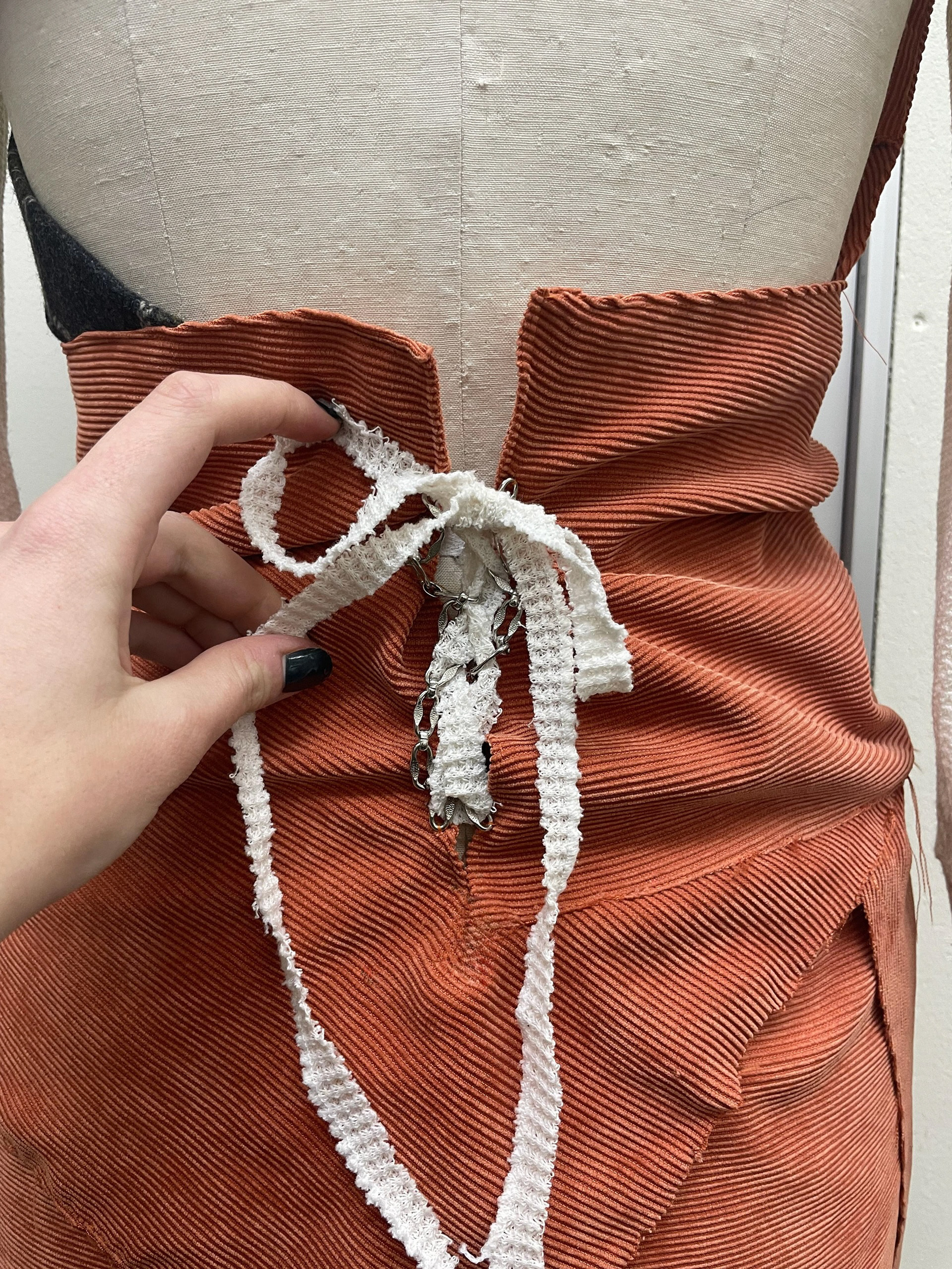 Dress draped from pieces of corduroy pants and wool plaid skirt, attached to waffle knit top with upcycled chain. Lace up back closure.