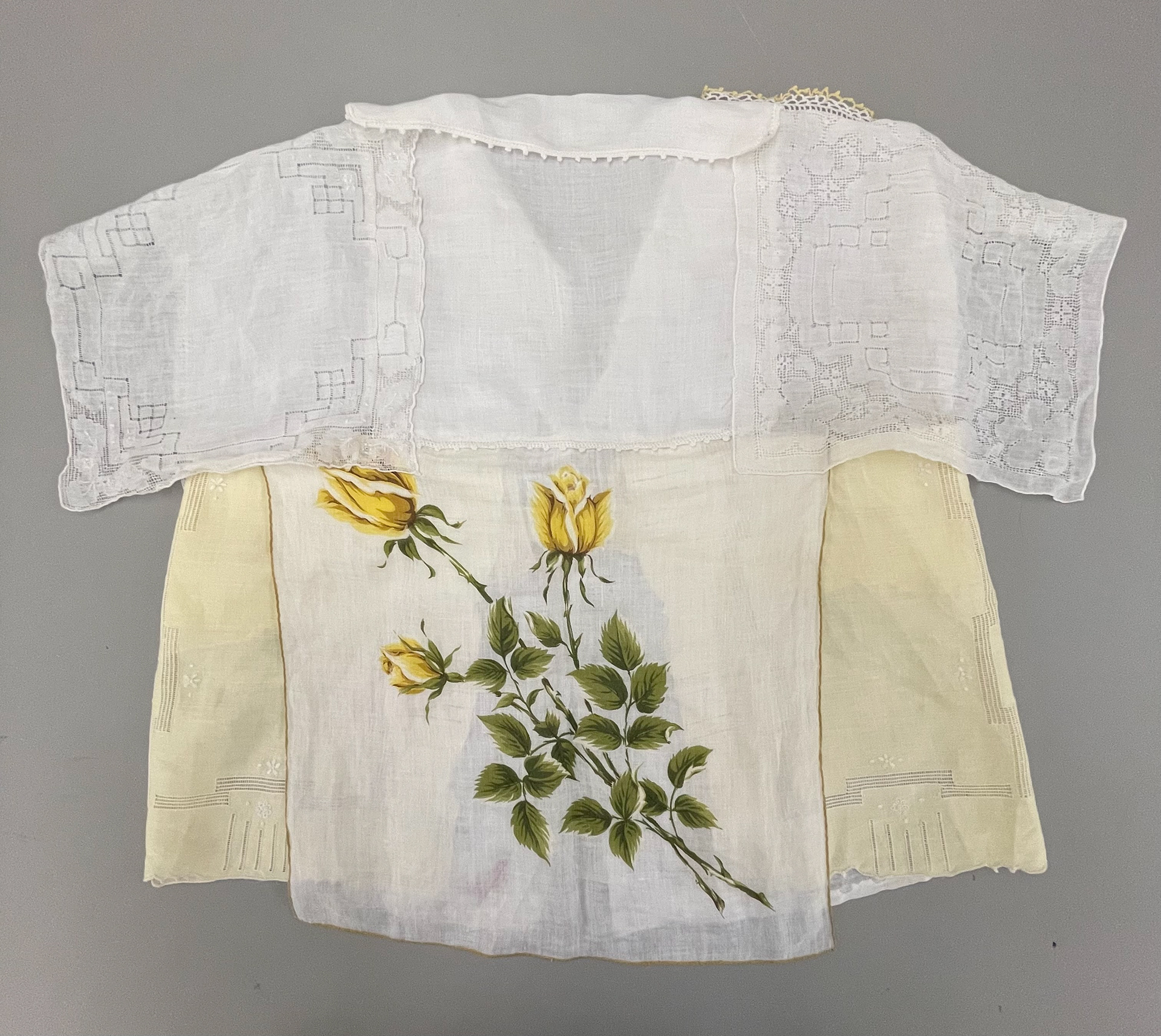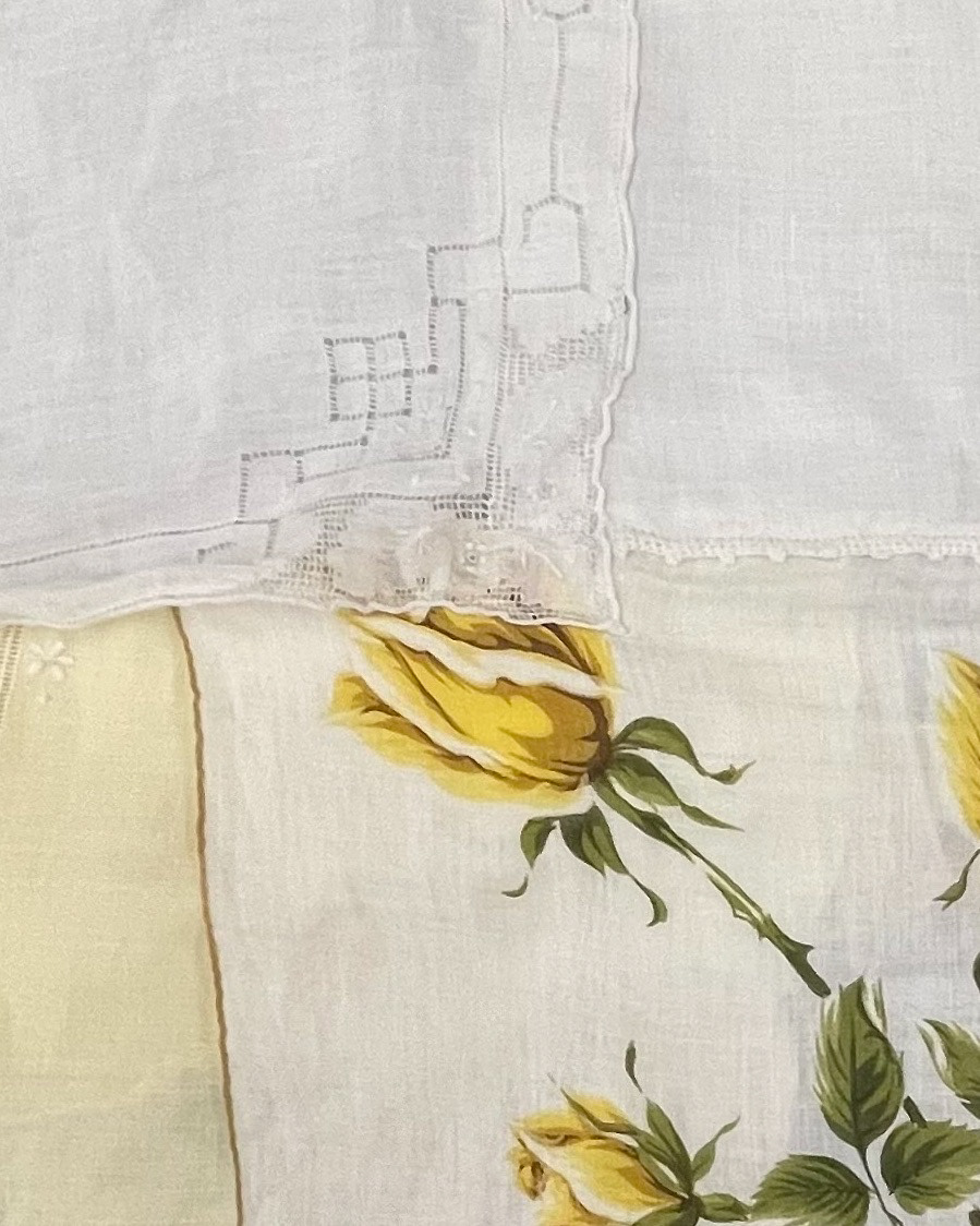 Pieced together vintage handkerchiefs. All pieces are uncut and are instead draped, overlapped, and sewn to create this classic silhouette.