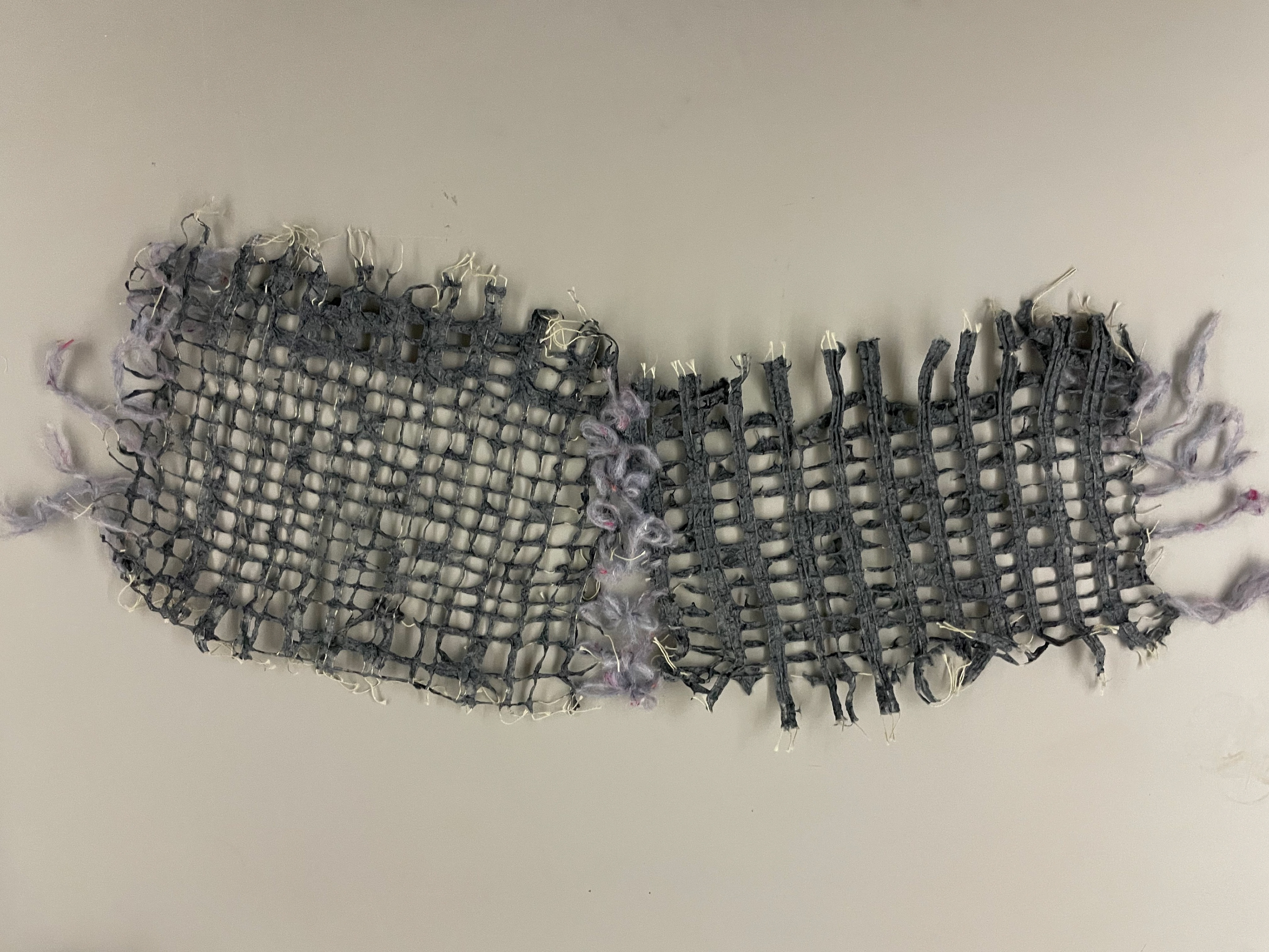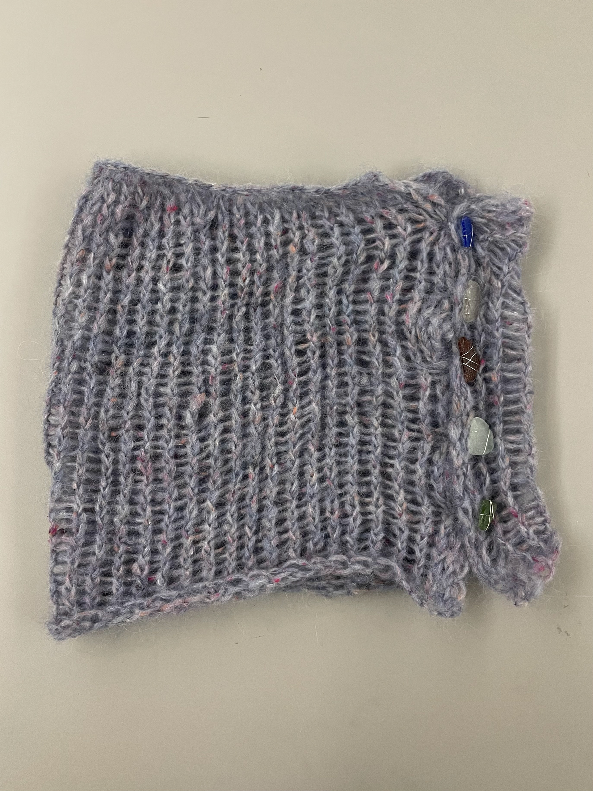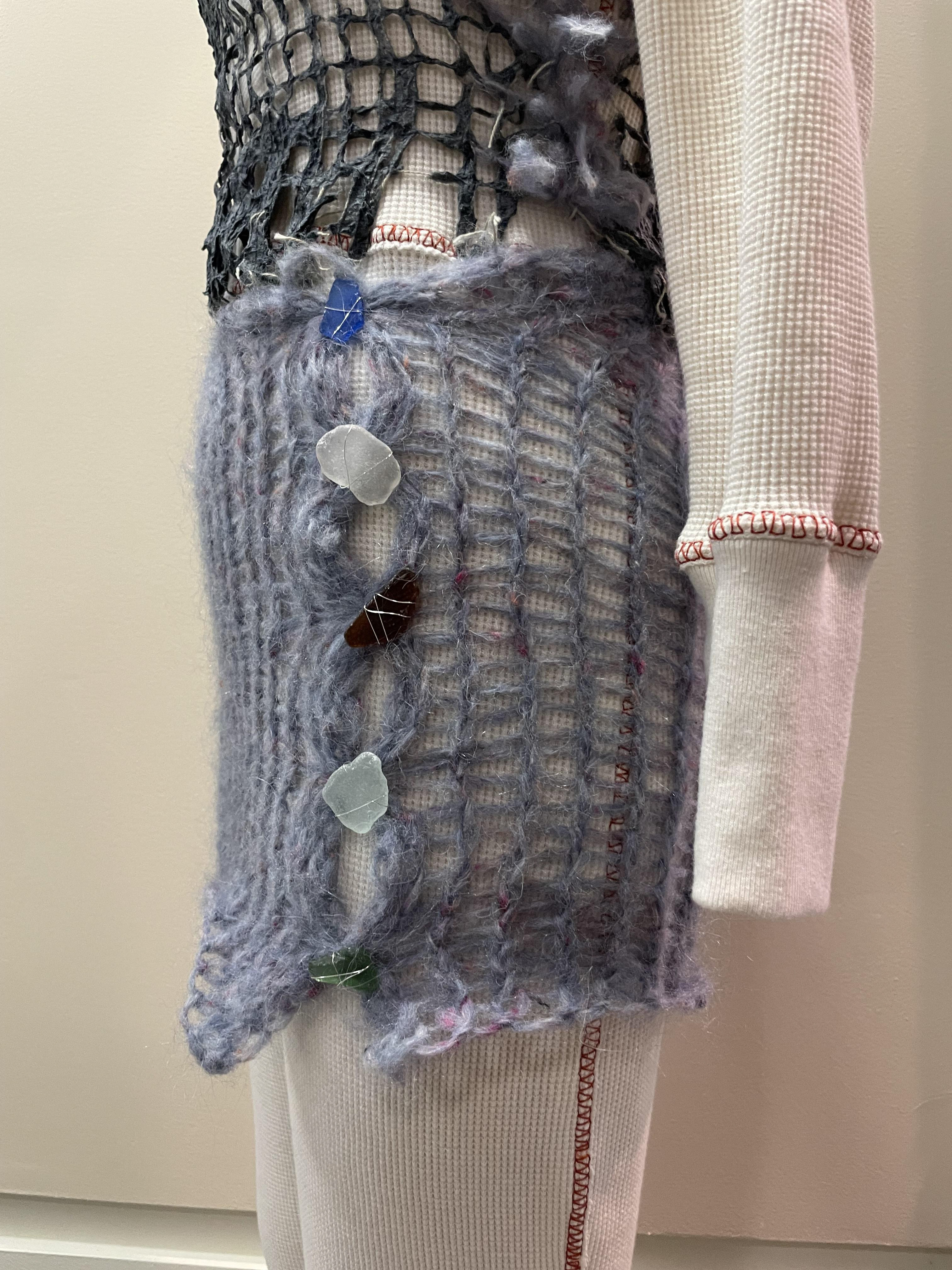 Waffle-knit jumpsuit baselayer; paper string-grid top and hand-knit skirt with beach glass buttons.